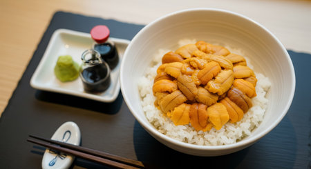 A Bowl of Uni Donburi with Soy Sauce and Wasabi
