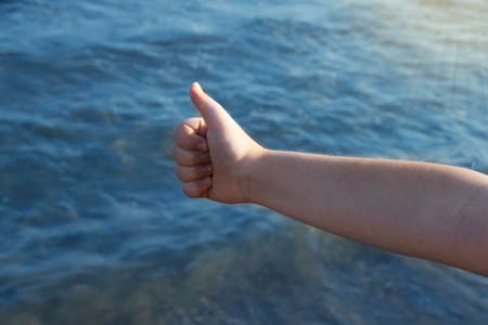 A hand confidently shows a thumbs up, radiating positivity and support in a bright setting.
