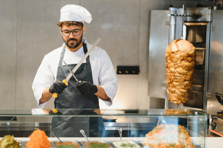 Professional chef skillfully slicing delicious shawarma meat from a rotating spit in a commercial kitchen, preparing a popular street food dish