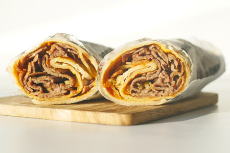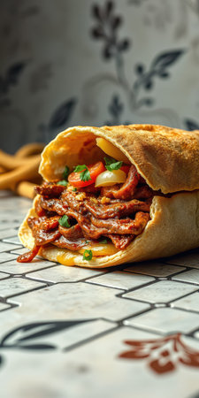 Savory grilled meat wrap served in a casual dining setting with fresh ingredients and condiments
