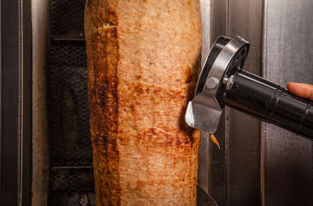 Rotating spit with meat being sliced for shawarma. Juicy and flavorful cuts for a delicious wrap. Ideal for food preparation and street food themes