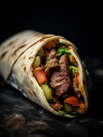 Mouthwatering grilled meat wrapped in tortillas with fresh vegetables and herbs for a flavorful meal