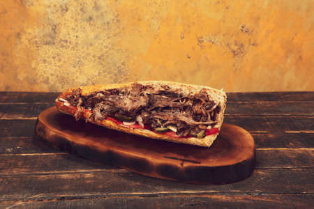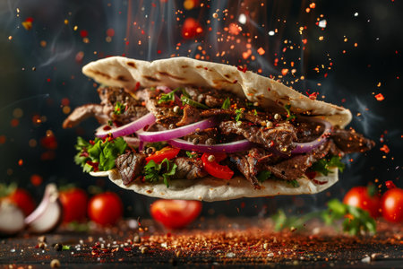 Delicious turkish shawarma doner sandwich with grilled beef and flying ingredients