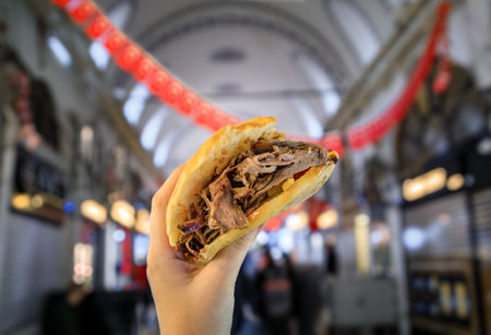 A woman s hand holds a fresh doner kebab inside the Grand Bazaar in Istanbul, Turkey, a perfect idea for food travel and exploring local cuisine