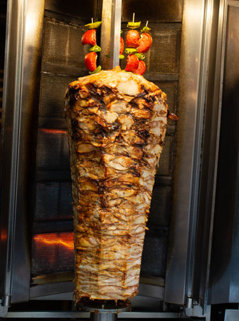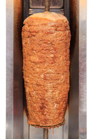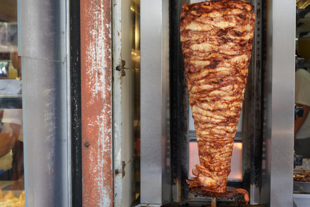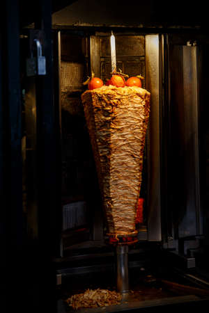 Traditional doner kebab roasted on vertical rotisserie in Turkish street restaurant