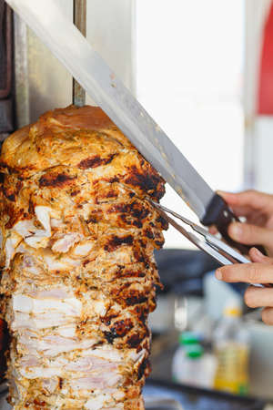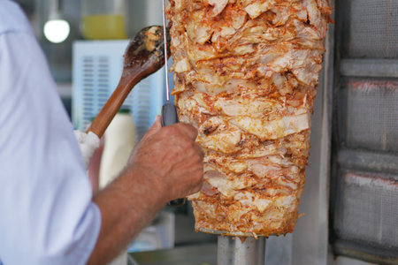 Rotating spit with meat being sliced for shawarma. Juicy and flavorful cuts for a delicious wrap. Ideal for food preparation and street food themes