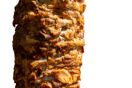 Close up shot of stacked meat roasting to be used in preparation of traditional Greek dish gyros or Turkish durum doner. Isolated on white background.