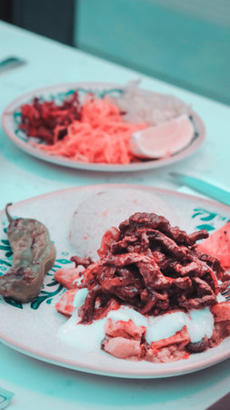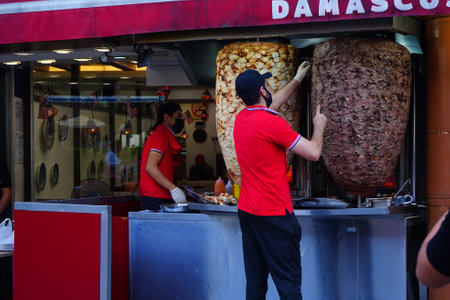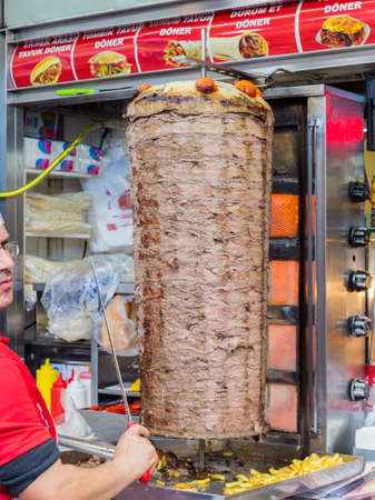Istanbul, Turkey - October 6, 2019: Traditional turkish food Doner kebab in a street of Istanbul