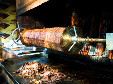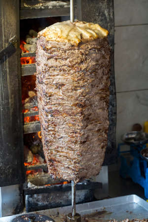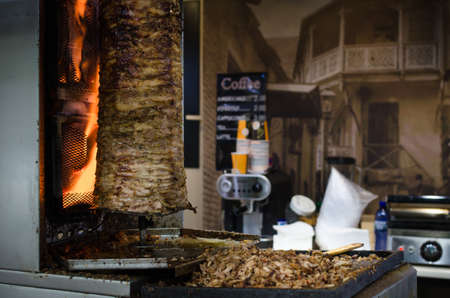 Preparation of arabic shaurma in Turkey. Tasty shawerma meat grilled on fire.