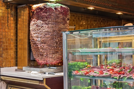 Kebab meat on rotary grill - Turkish doner beef kebab stand in Istanbul, Turkey