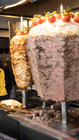 Cutting beef and lamb on a split for cooking doner kebab. Process of making turkish shawarma in turkish street food market