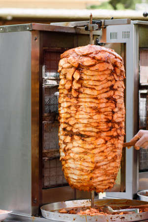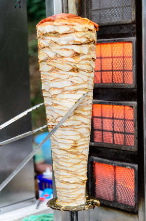 Traditional Turkish food Doner Kebab. Chicken meat grilled on the street