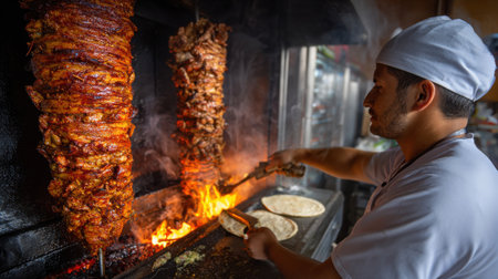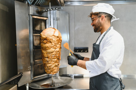 Professional chef skillfully slicing delicious shawarma meat from a rotating spit in a commercial kitchen, preparing a popular street food dish