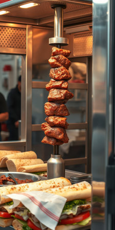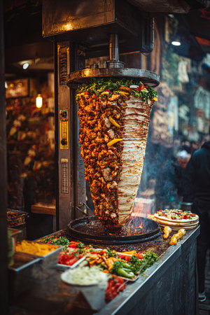 Delicious rotating meats prepared in a busy street food stall in the evening