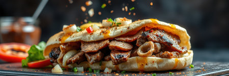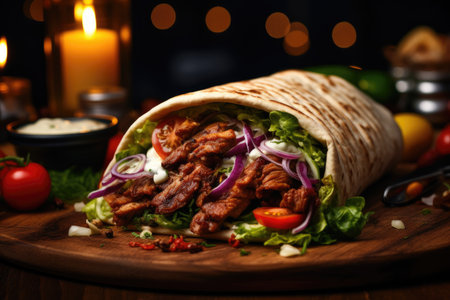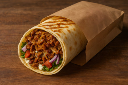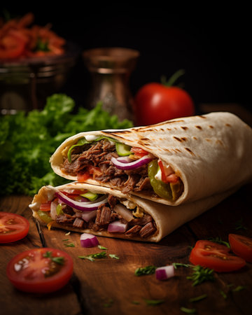 Savory grilled meat wrap served in a casual dining setting with fresh ingredients and condiments