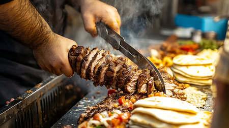 Experience the art of slicing succulent meat at a vibrant street food market.
