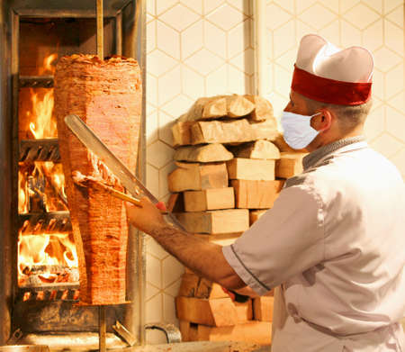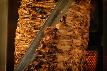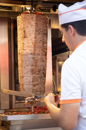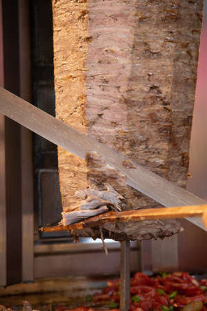 Traditional Turkish food Doner Kebab. Turnspit skewing kebap kebab shawarma