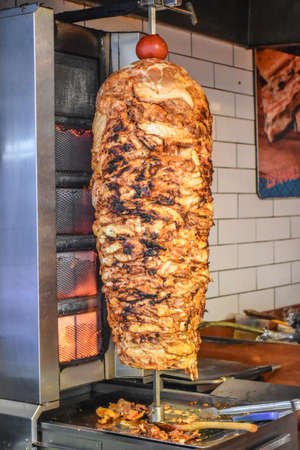Traditional Turkish Doner Kebab meat. Shawarma or gyros. Turkish, greek or middle eastern arab style chicken doner kebab food in restaurant.