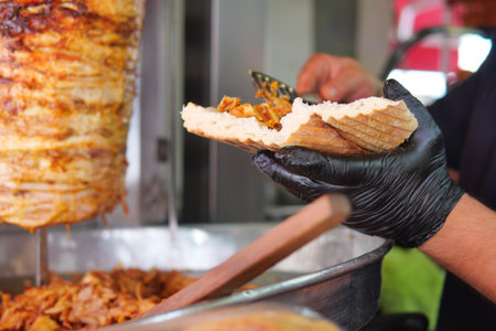 Preparation of Turkish shawarma. the cook's hands in rubber gloves apply a delicious chopped fried chicken meat with a spatula to put it into cakes with shawarma. street food, fast real life, lifestyle.