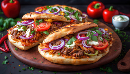 High angle of doner kebab with appetizing meat and fresh vegetables placed on table