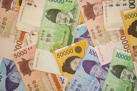 Korean paper money, won, and cash banknotes for financial and business transactions. Korean money as a background for your design