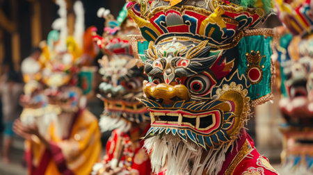Traditional costumes, cultural festival, vibrant colors, heritage celebration, Asian cultural attire, ornate decorations, face paint, historical significance in a festive setting