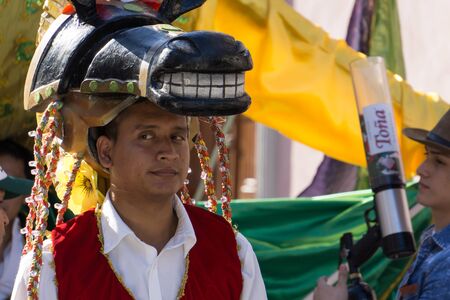 Granada, Nicaragua – February 15, 2017: People wearing traditional dress and colorful masks during celebration of Carnival. Nicaragua traditional folk