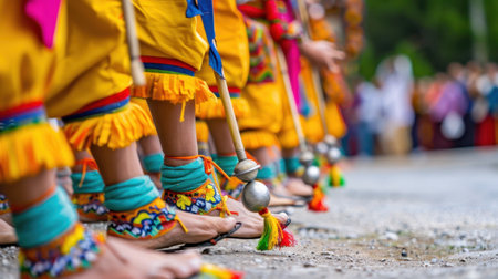 Immerse yourself in the vibrant atmosphere of a traditional cultural parade showcasing intricate costumes and unique footwear. This celebration highlights rich heritage and artistry through detailed patterns and vibrant colors.