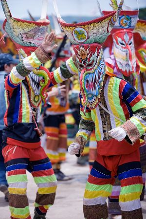 Juli Temple, lamas on mask of gods and dancing for prayer of peace and luck.