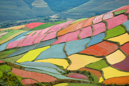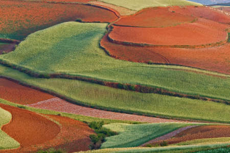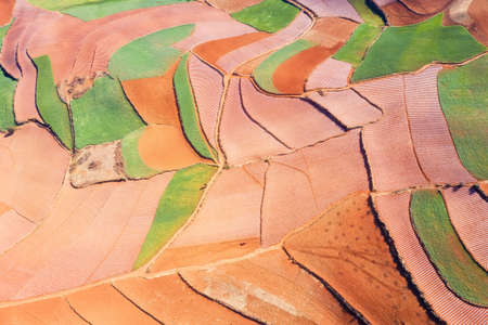 Dongchuan Red Earth Multi-Colored Terraces - Red Soil, Green Grass, Layered Terraces in Yunnan Province, China. Chinese Countryside, Agriculture, Exotic Unique Landscape. Farmland, Agriculture