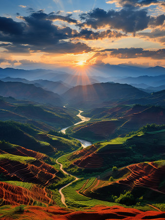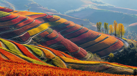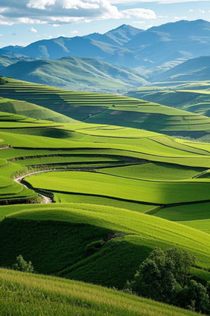 Rolling hillsides display terraced fields in this scenic landscape. The image captures the natural beauty with a warm color palette. Sunlight bathes the scene, highlighting the textures of the land. The composition emphasizes depth and scale, suggesting a vast outdoor setting during daylight.