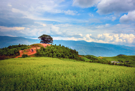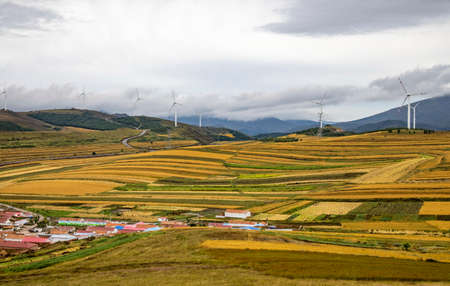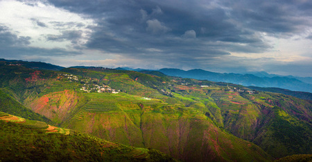 Panoramic view of chinese agriculture landscape with mountains and hills in the morning.