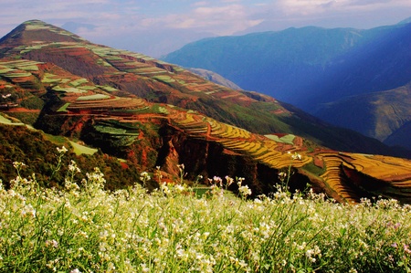 Mustard and flower field in autumn at countryside of Dong Chuan, red land, one of the landmarks in Kunming, yunnan province China. (With fog, mist, haze effect at background and blur foreground.)