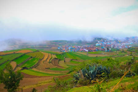 Green hills with red soil, green rice and traditional african houses. Madagascar