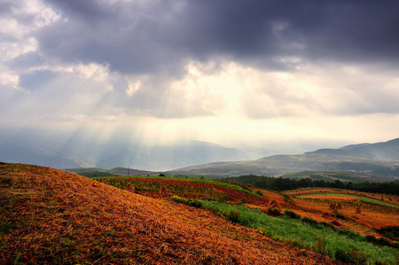 Bright sunbeam shines through ripple clouds on wheat terraces at dusk, abstract curves and layers of wheat terraces in spotlights, rural scene in Yunnan, South China. Selective focus.