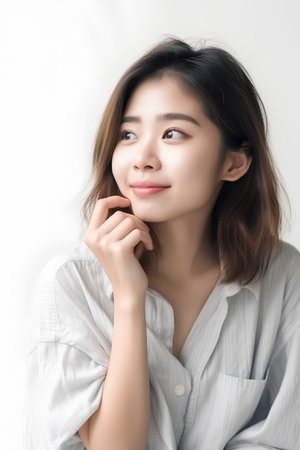 Pretty Asian individual with a warm, inviting smile, background for copy space or marketing purposes