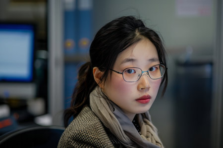 photo of asian woman in jacket outfit with colorful light in background, generative AI