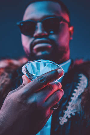 Rich african man with fur holding luxurious diamond