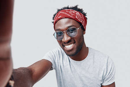 Self portrait of handsome young African man smiling and looking at camera while standing against grey background