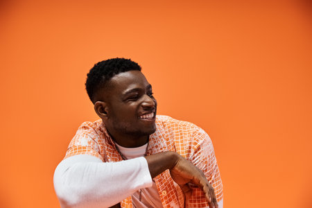 Handsome man in orange shirt striking a pose against orange backdrop.