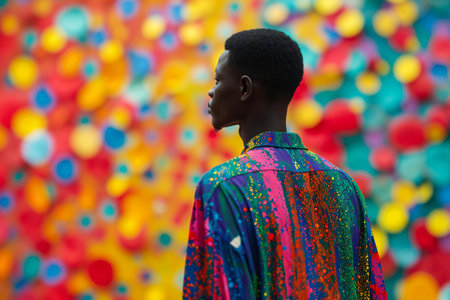Rear view of young African man in colorful shirt standing at colorful background