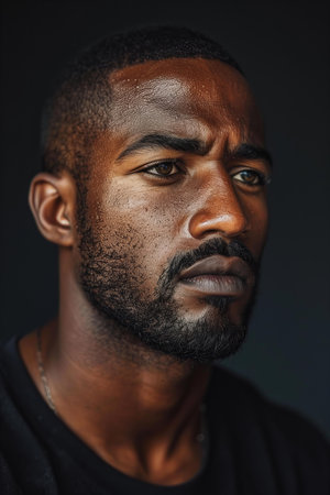 Very close up portrait of head black young man.