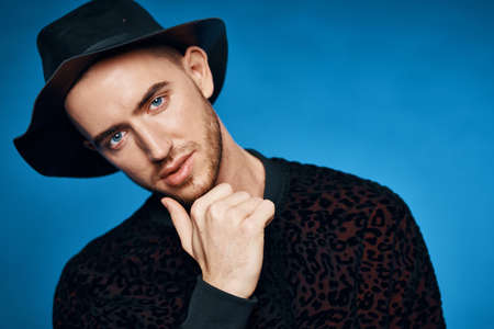 Portrait of stylish handsome caucasian man fashion model in t shirt and cap, studio shot.