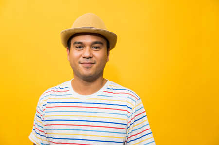 Young handsome asian men wearing casual black shirt and hat on white background in Sai Gon city, Vietnam.