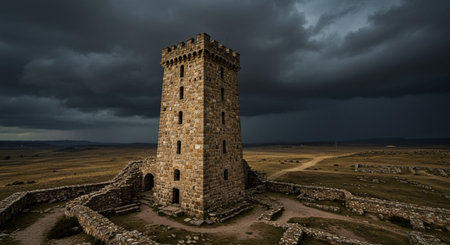 Golden rays illuminate the weathered stone walls of a historic fortress, evoking a sense of mystery.