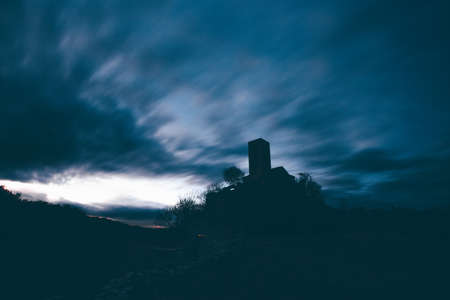 Old vintage ruined abandoned tower. Ruins of historical heritage. Travel background with copy space for text.