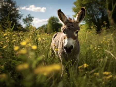Cute fluffy donkey enjoys a sunny day in a lush green setting, showcasing its funny expressions and playful demeanor in a rural landscape