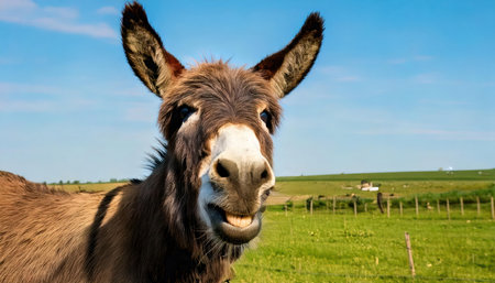 A joyful donkey grins widely, showcasing its bright personality against a serene farm background. This cheerful scene captures the essence of rural life.