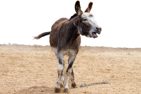 Portrait of a donkey on a white background in the desert.