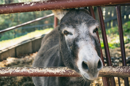 Donkey in the farm, close-up, selective focus.